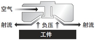 利用圆形喷嘴沿本体喷出空气所产生的负压来吸附工件,当工件接近时,空气会发挥斥力的作用,阻止工件靠近,因此在非接触状态下能够实现悬垂吸附保持。